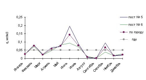 В 1997г. среднемесячные концентрации в городе были выше нормы в 1.6 раза в мае и июле, в 2.8 раза - в июне, а в зимние месяцы - в феврале (1.5 ПДК) и октябре (1.3 ПДК).